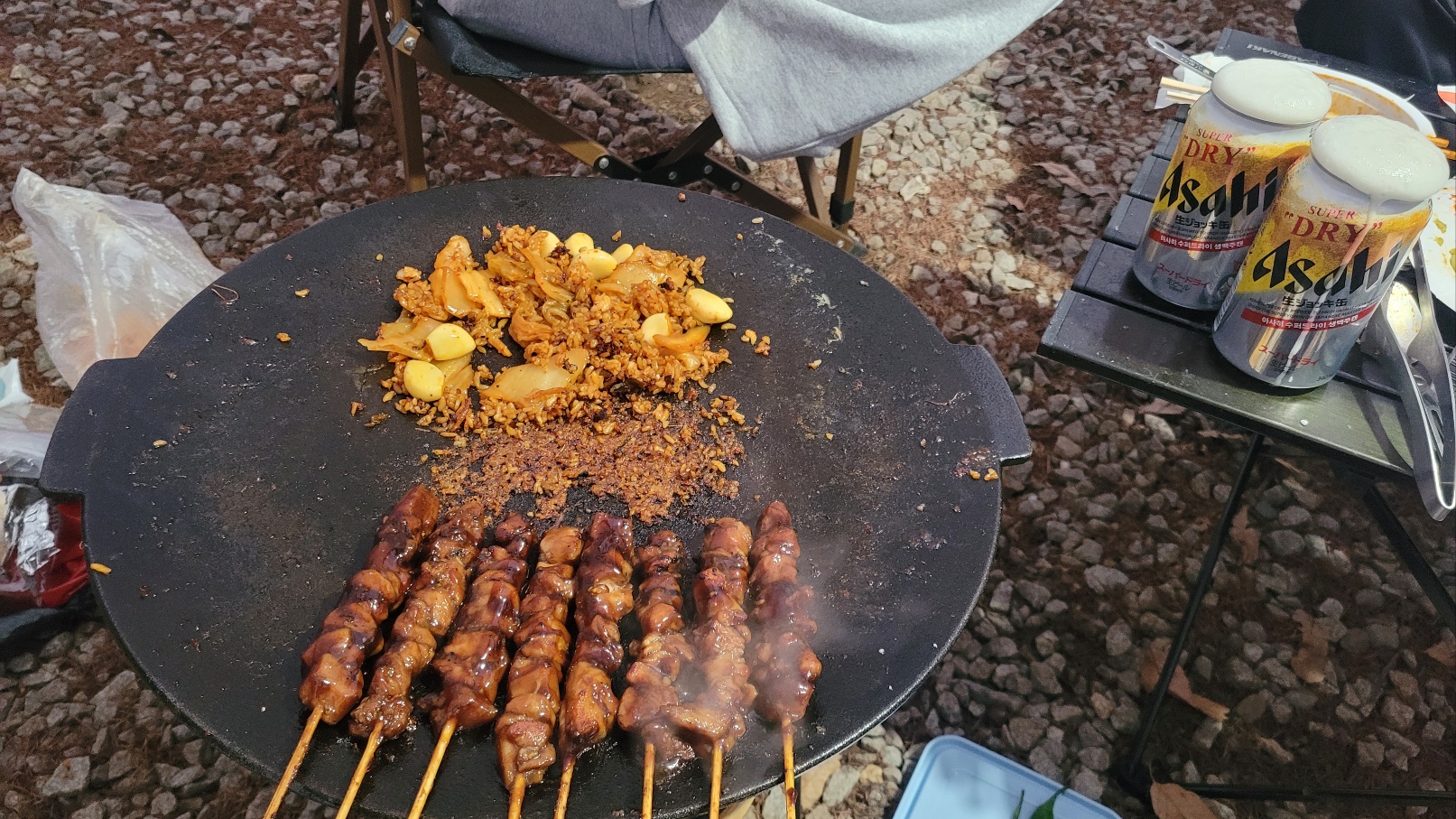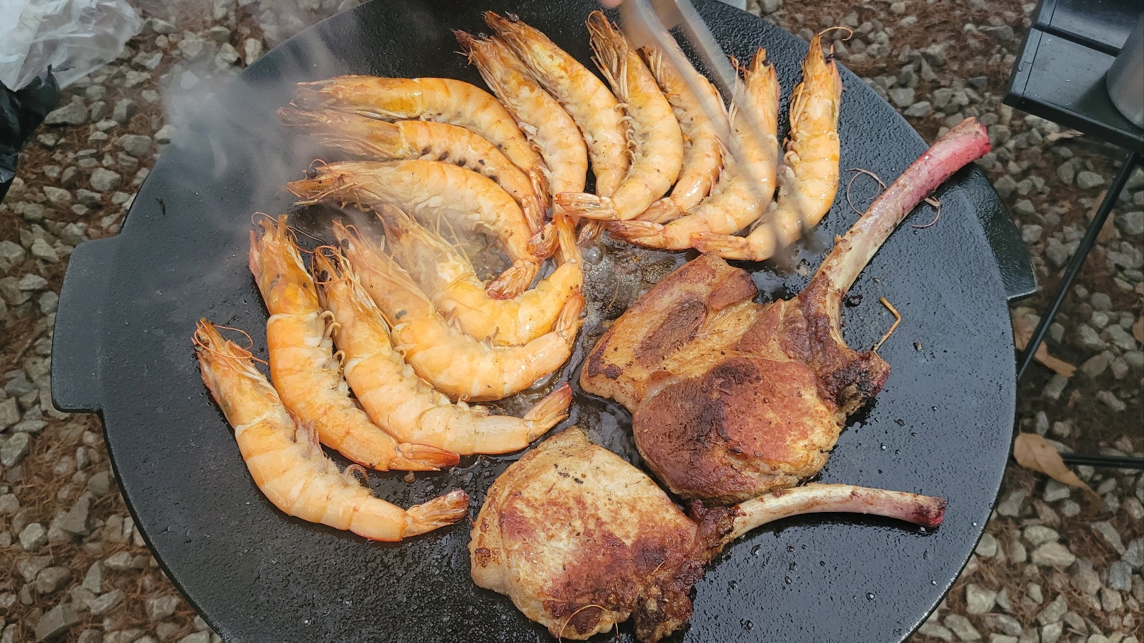캠핑의 하이라이트는 역시 맛있는 음식입니다. 소나무 사이로 비치는 달빛과 함께 돈마호크, 돼지 특수 부위, 새우(외포항 구매), 닭꼬치, 볶음밥을 먹었습니다. 조용한 숲속에서 들리는 풀벌레 소리, 가끔 울리는 부엉이 소리까지… 최고였습니다.