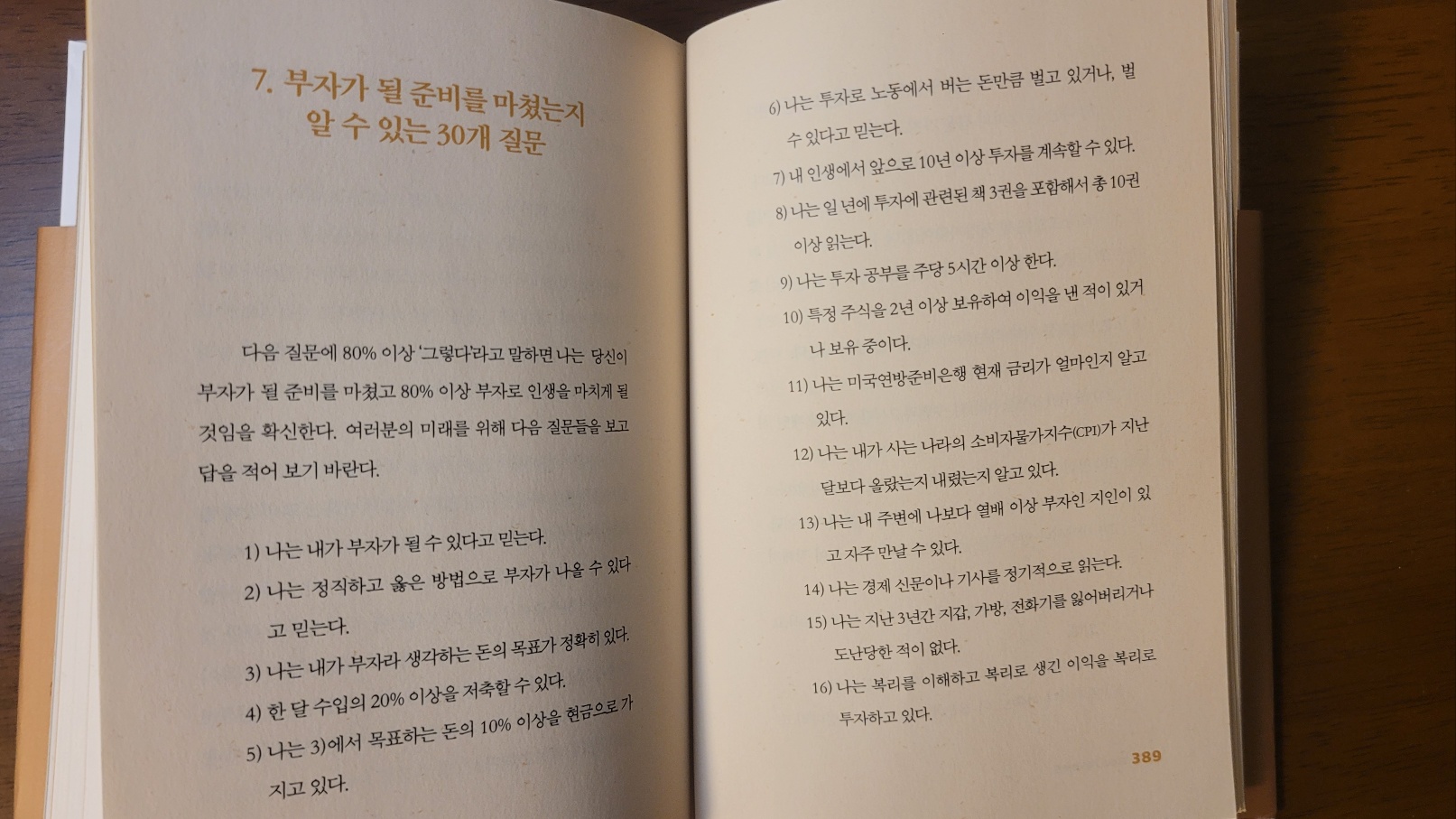 또 한 가지 목록은 부자가 될 준비를 마쳤는지 알 수 있는 30개 질문 목록입니다. 이 30가지의 질문을, 책을 읽고 있는 나의 모습과 비교하며 나는 정말 부자가 될 준비가 됐는지 되돌아보게 하는 중요한 목록입니다. 책을 모두 완독한 지 약 한 달이 지났지만 아직도 이 목록은 수시로 꺼내어 확인합니다.
