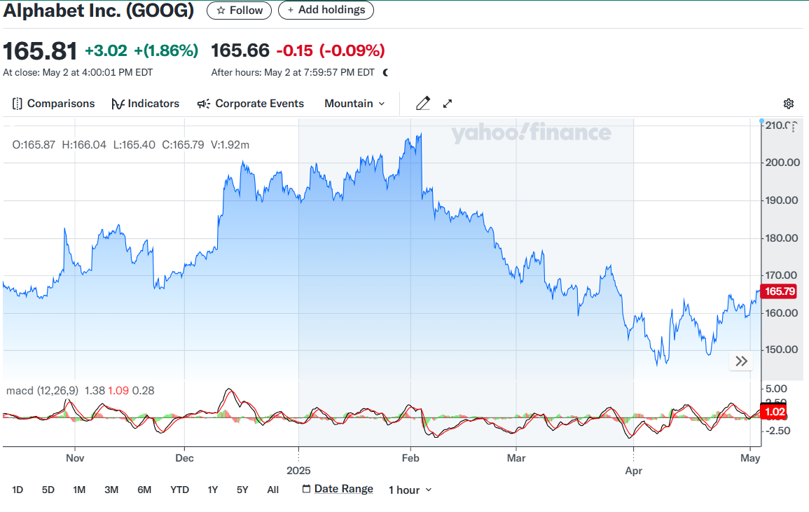 아래는 구글(GOOG) 주식 차트에 MACD라는 지표를 적용한 화면이에요. MACD는 주가의 추세(오를지, 내릴지)를 파악하는 데 도움을 주는 도구인데요, 차트를 보면 파란색 선이 주황색 선 위로 올라가는 모습이 보여요. 이런 상황을 ‘상승 신호’라고 볼 수 있어요. 또, 아래쪽 막대그래프들도 점점 위쪽으로 길어지고 있는데, 이건 주가가 점점 힘을 받고 있다는 뜻이에요.