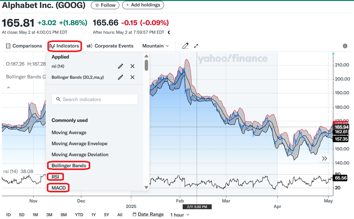 이 차트는 구글(GOOG) 주식에 RSI와 볼린저밴드 지표를 같이 적용한 모습이에요. 이 지표는 현재 투자자들의 심리를 예측할 수 있는 지표입니다. RSI는 현재 66.22입니다. 30 이하로 떨어지면 과매도로 볼 수 있고요. 70 이상으로 올라가면, 과매수로 예상하셔도 됩니다. 그렇다면 중간이 약 50정도로 예상하시면 됩니다. 위험하지는 않지만 약간 매수율이 높습니다. 볼린저 밴드를 보면 157.47~165.79 USD (현재 주가는 165.81 USD임을 참고)를 보이는데요. 큰 변동은 없을 수 있지만, 차근차근 내려갈지 차근차근 올라갈 지는 예상할 수 없습니다. 단순하게 보면 순간에 가격이 급변하지는 않을 것으로 예상됩니다.