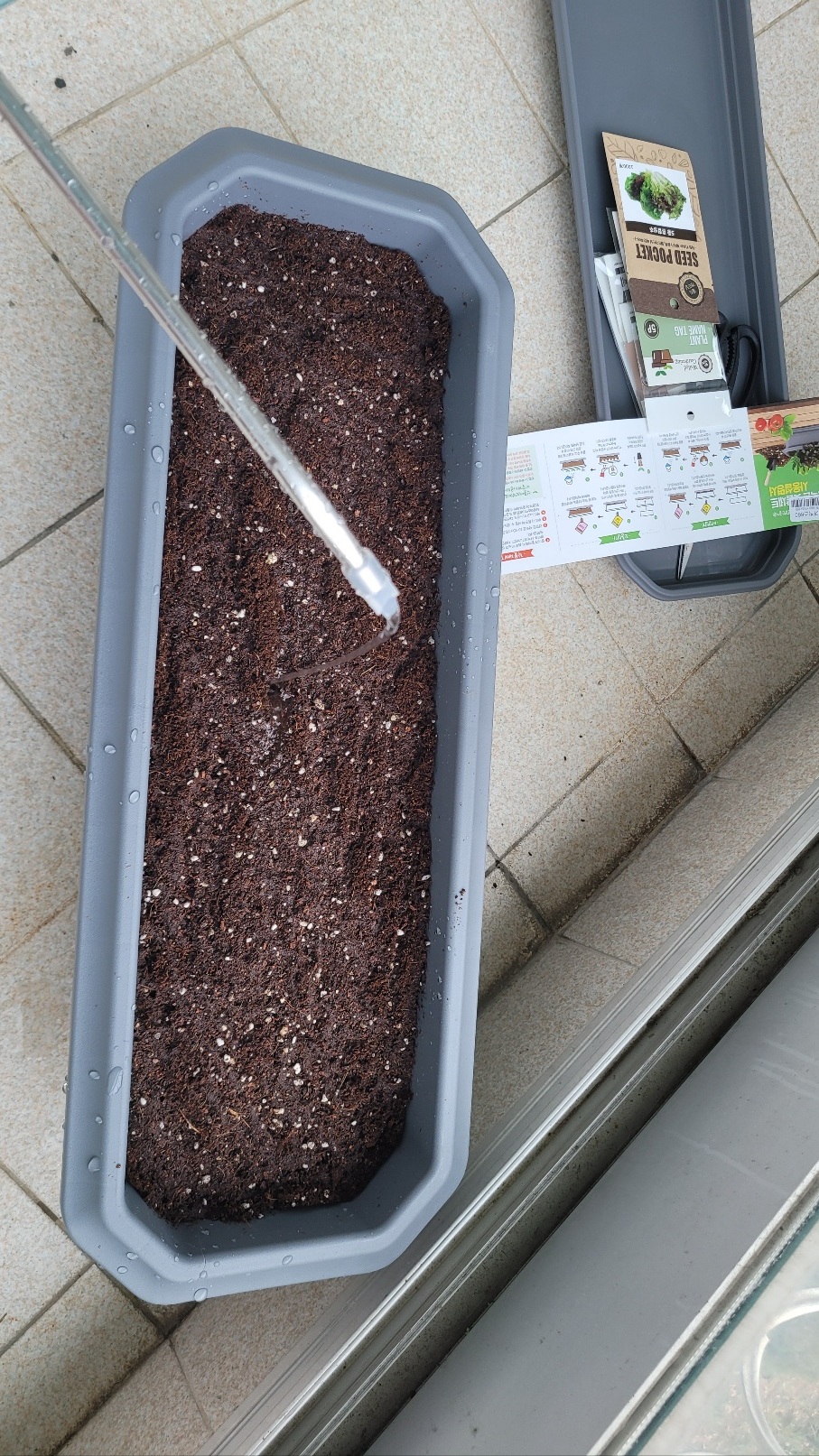 마지막으로 배양토를 덥고 다시 물을 줍니다. 이때는 많이는 주지 않고 약 0.5리터 정도 주었습니다. 추가로 식물 영양제도 있는데요. 이거는 조금 새싹이 자라면 주도록 하겠습니다.