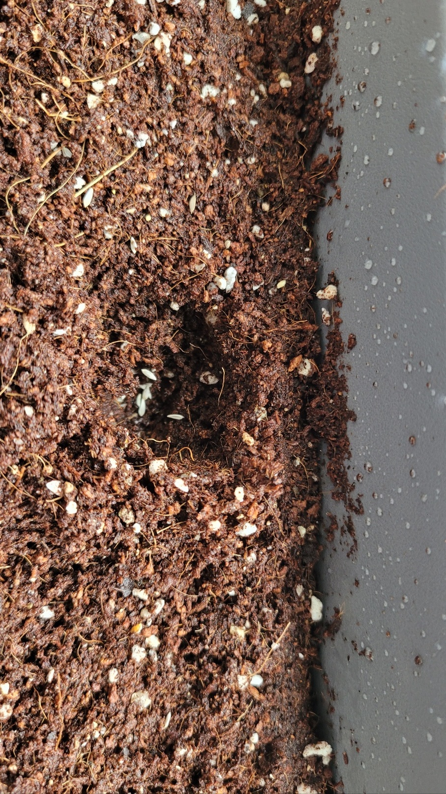 세 번째는 배양토를 약 1~2cm 파서 씨앗을 뿌리는데 너무 빽빽하지 않게 뿌려야 하는데.... 이 부분이 고민이 많이 되더라고요. 그래서 그냥 가운데 터널을 뚫고 양옆에 구멍을 4개씩 만들어 심었습니다. 그냥 특별하게 기준이 정해진 건 아니어서 일단 씨앗을 심었습니다. (나중에 새싹이 자라면 솎아야겠어요) 잘한 건지는 모르겠네요.