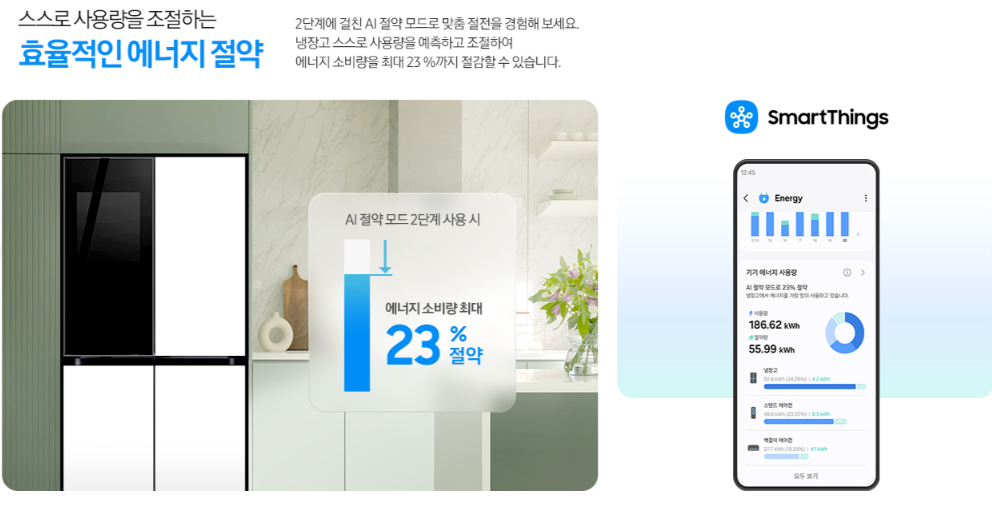 삼성의 스마트싱스 앱과 연동이 가능해 스마트폰으로 냉장고의 상태를 원격으로 모니터링하고 제어할 수 있습니다. 또한 AI 절약모드로 불필요한 에너지 소비를 줄이고 전기요금을 절감할 수 있습니다.