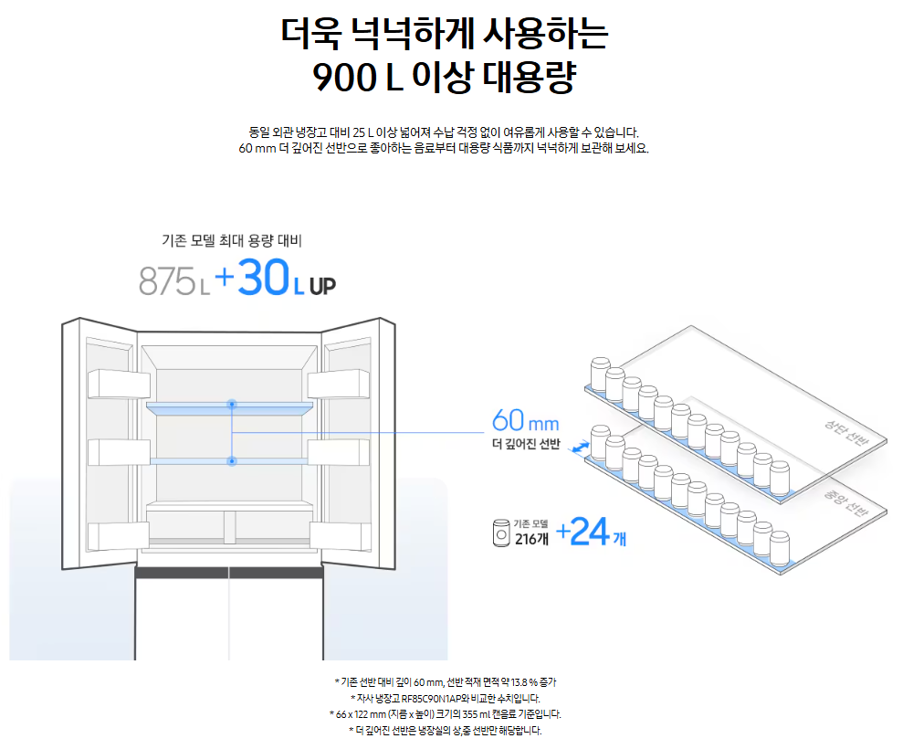 905L라는 대용량은 대가족이나 외식 대신 집밥을 선호하는 가정에 최적화되어 있습니다. 넉넉한 공간 덕분에 식재료를 여유롭게 보관할 수 있고, 대용량 수납이 가능한 선반과 도어 포켓이 잘 배치되어 있어 실용성을 높였습니다.