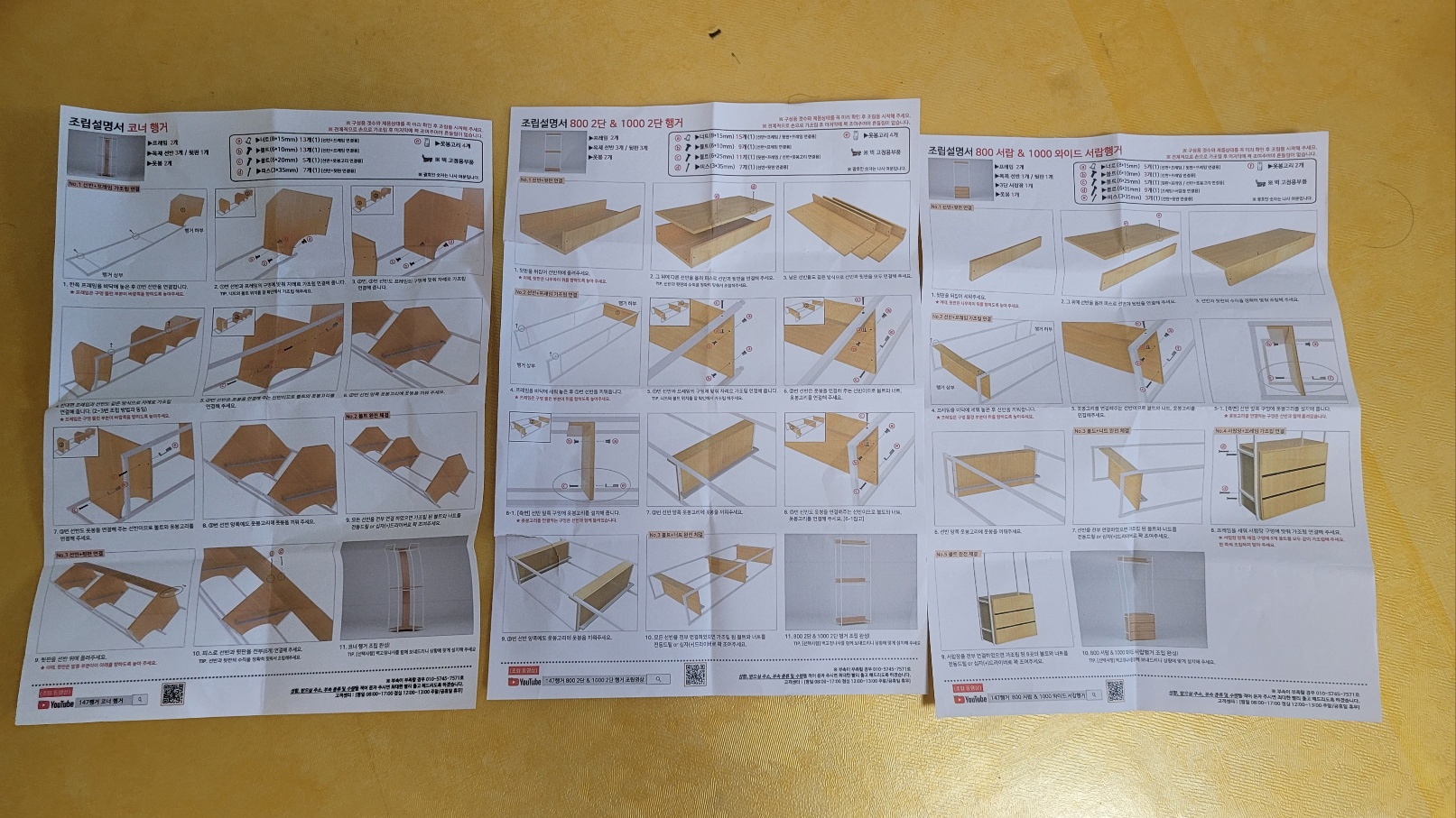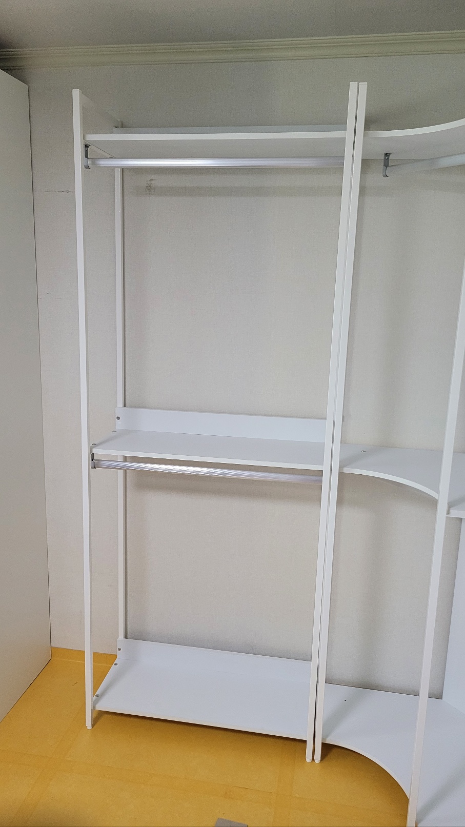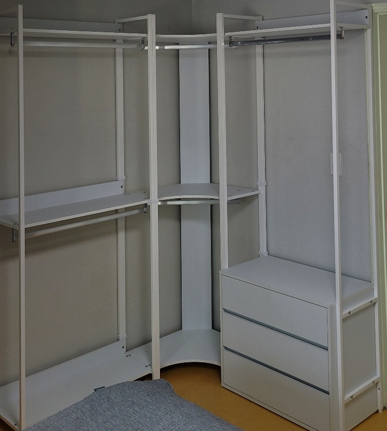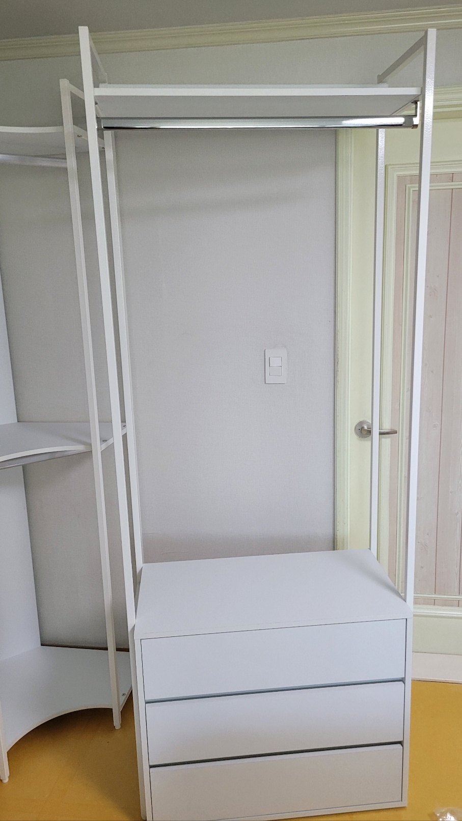 이런 식으로 3개의 프레임이 완성됩니다. 상, 하부 두 개로 구분된 2단 행거와 하단 서랍장과 상단 행거가 있는 서랍행거 그리고 이 둘을 이어주는 코너 행거입니다. 이 제품은 저의 집 남은 공간에 매우 적합했던 포인트는 코너 행거라는 점이었습니다. 위의 사진처럼 코너 공간에 적합했죠. 참고로 다행인 부분은 서랍장이 조립이 된 제품으로 배송되었습니다.