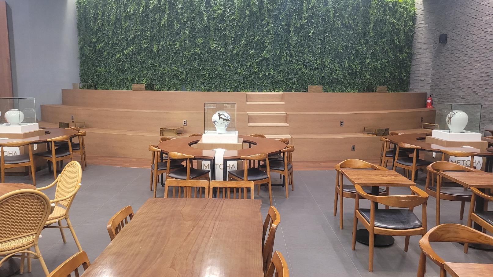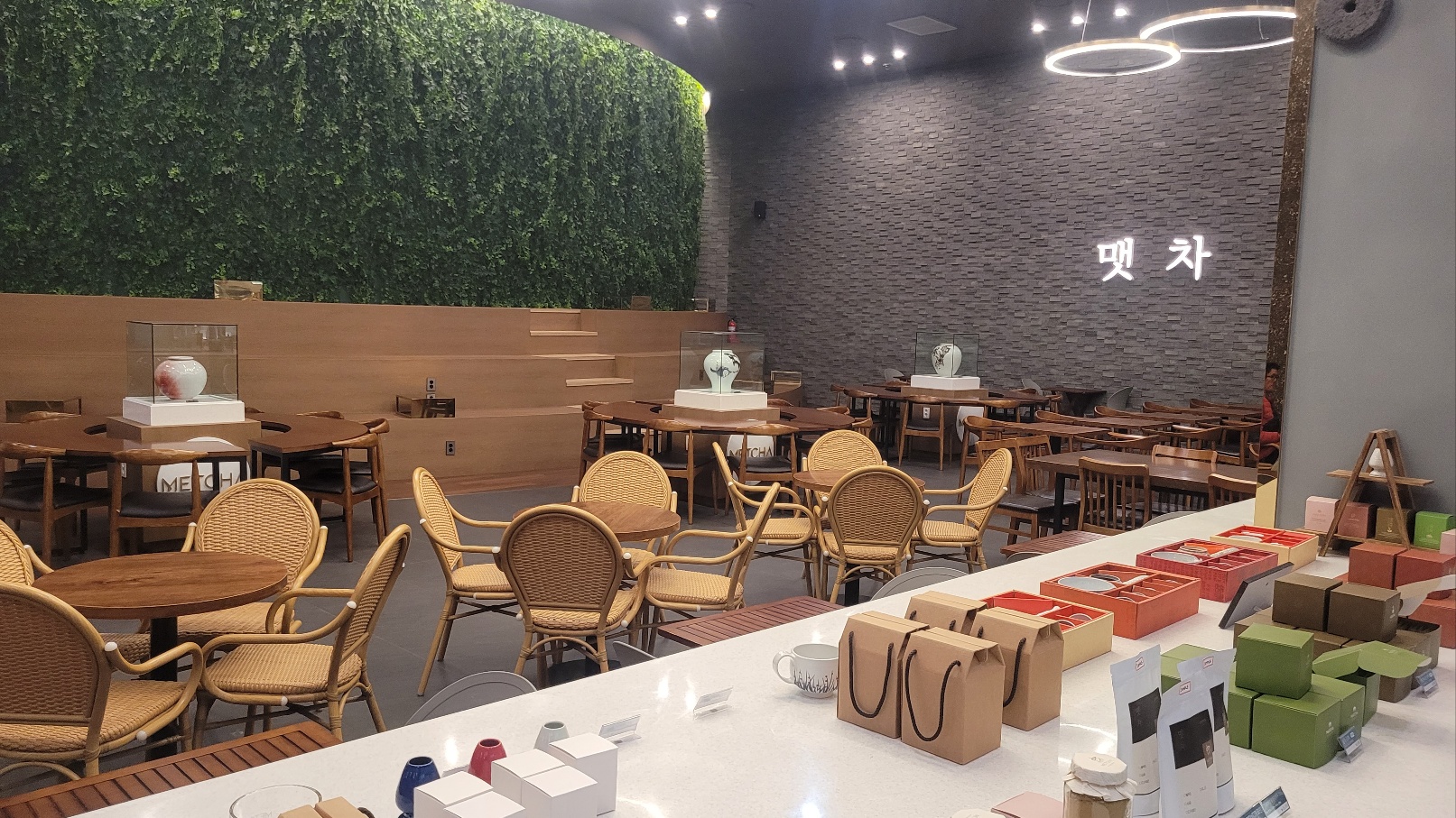 맷차 카페는 일본 전통 찻집에서 영감을 받은 미니멀하면서도 세련된 인테리어로, 은은한 조명과 원목 인테리어가 조화를 이룹니다.