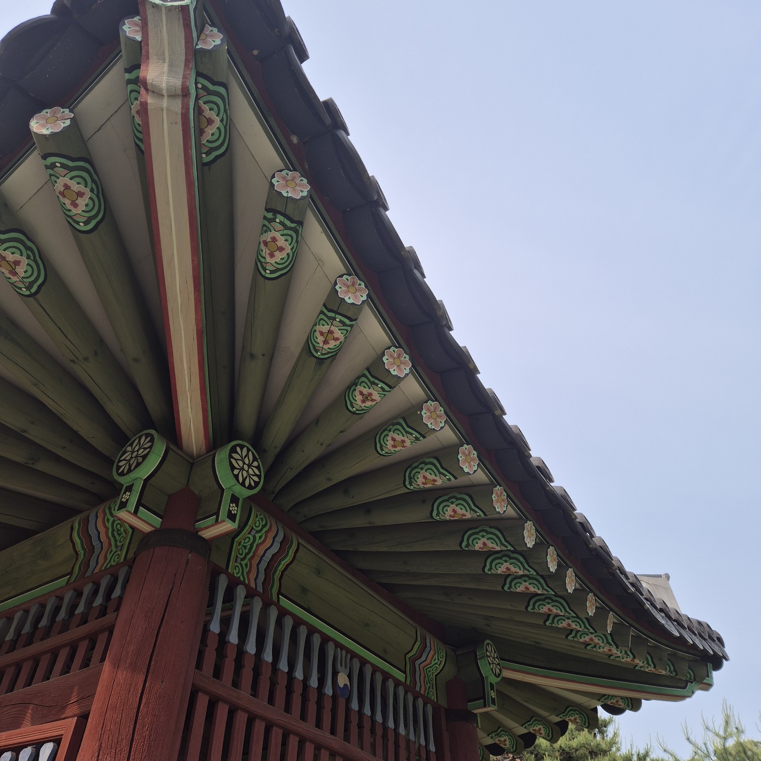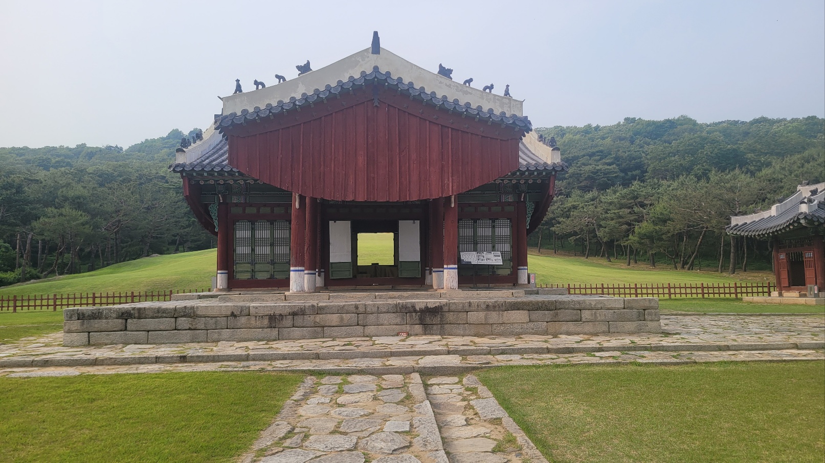 홍살문은 왕릉의 입구를 상징하며 신성한 영역으로 들어선다는 의미를 갖습니다. 홍살문을 지나면 정자각이라는 제례 공간이 등장하는데, 조선 왕릉 양식을 대표하는 전통 구조물입니다.