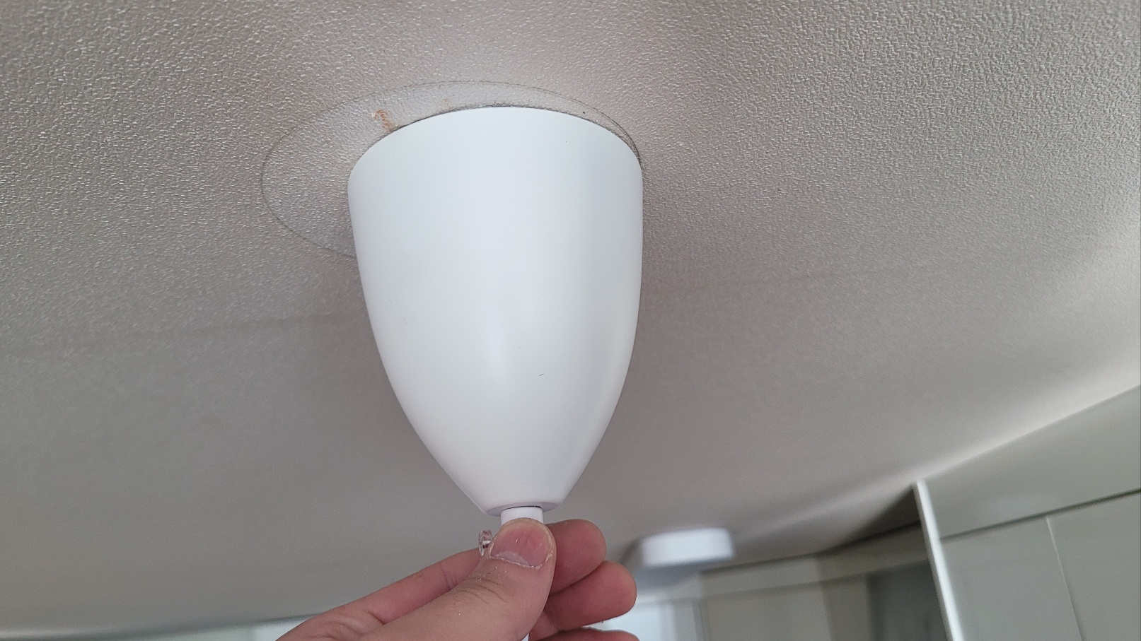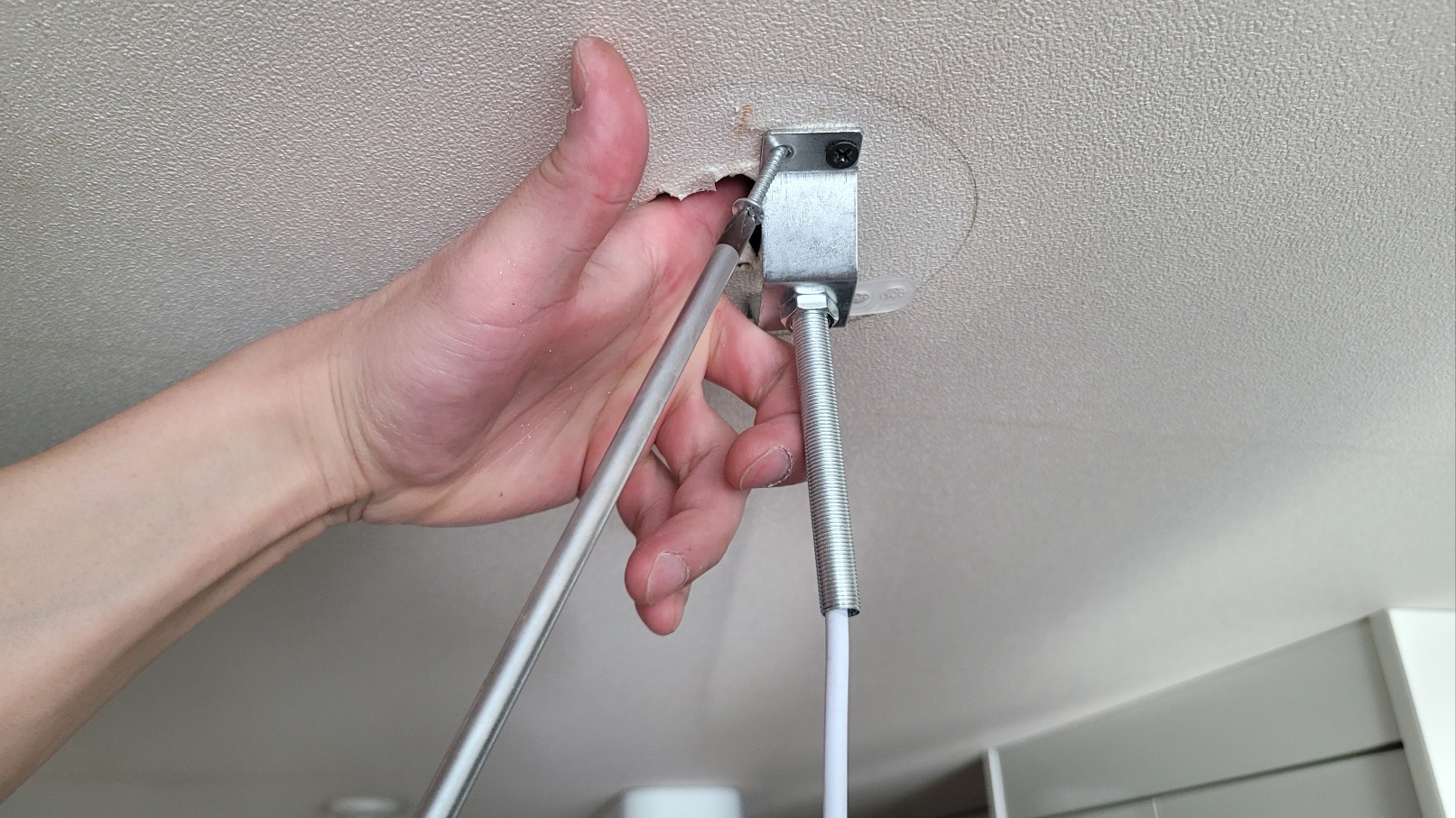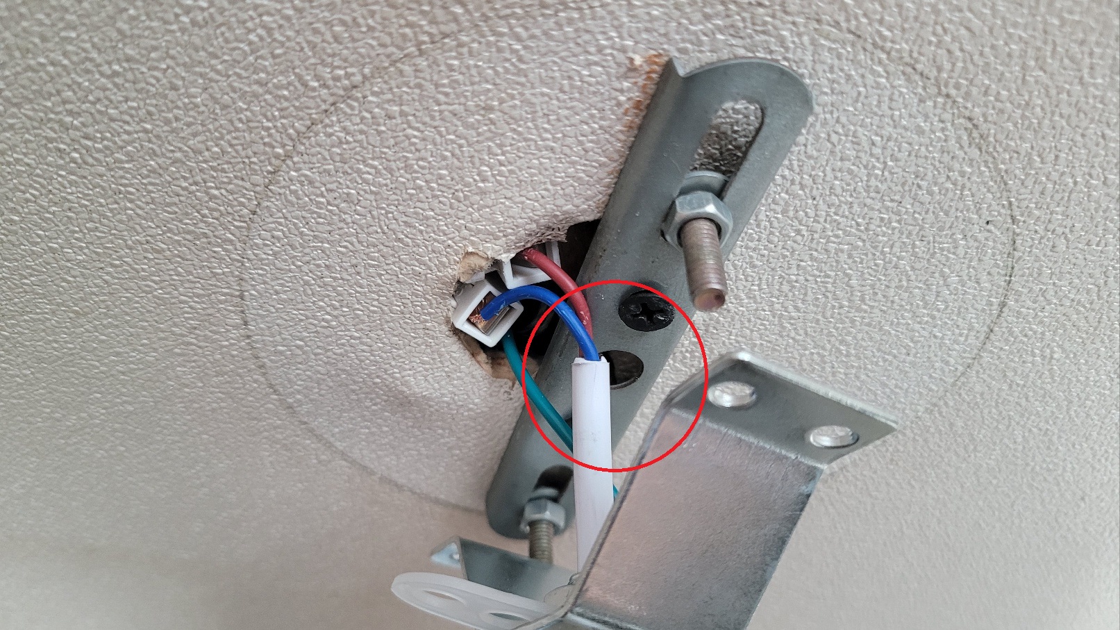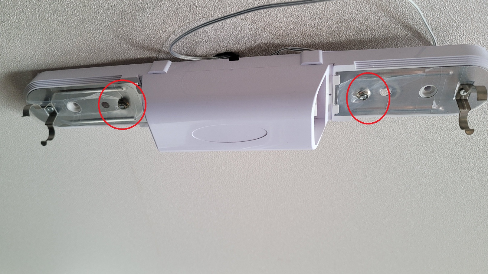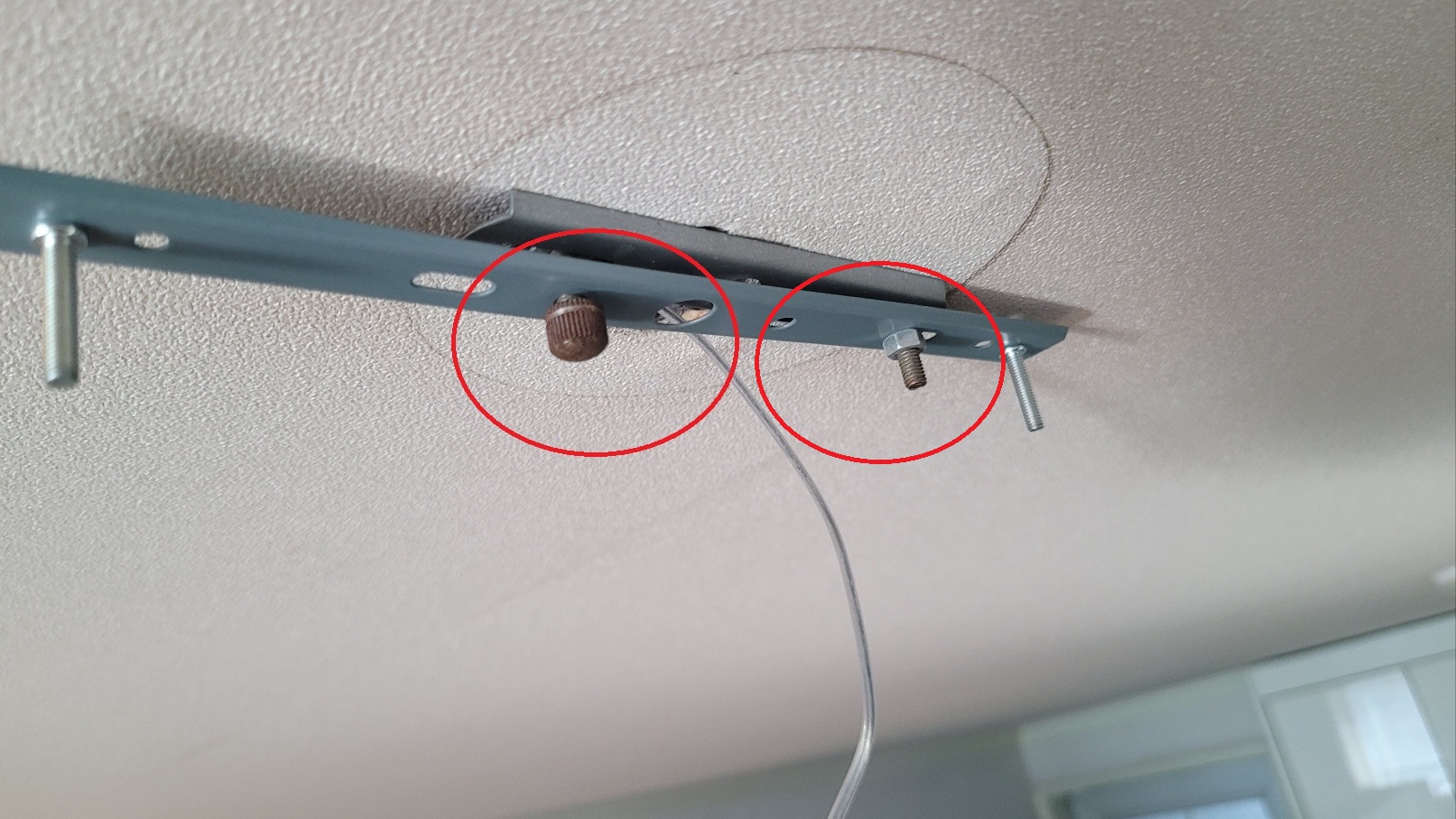 프레임을 제거하기 위해서는 두 개의 너트를 풀어야 하는데요. 조명이 삐딱하게 매달려 있던 이유가 말도 안 되는 너트를 장착해 놨었네요.... 너트가 제거되면 안쪽에 피스가 보입니다. 이것까지 제거하면 제거는 완전히 끝났습니다.