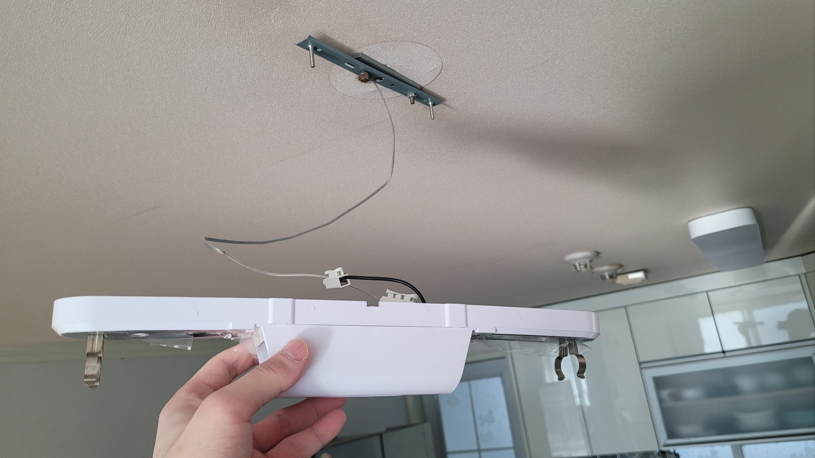 여기서 장착을 시작하기 전에 한 가지 중요한 것은 보통 아파트의 천장은 얇은 나무 합판으로 되어있어 조명의 프레임을 고정하기 매우 약합니다. 특히 지금 보여드리는 우리 집 같이 구축이라면 더욱 약해서 피스를 장착하면 무너질 가능성이 매우 큽니다.