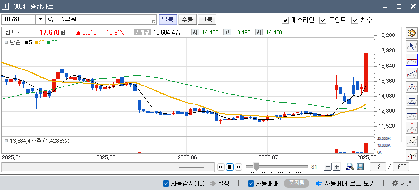 2025년 6월 5일, 풀무원의 주가가 하락세를 보이던 시점에서 저는 기회를 포착했습니다. 약간의 부정적인 뉴스가 있었지만, 본질가치가 훼손되었다기보다는 단기 이슈에 지나지 않았습니다. 재무제표를 꼼꼼히 분석한 후, 12,970원에 1차 매수를 진행하였습니다.