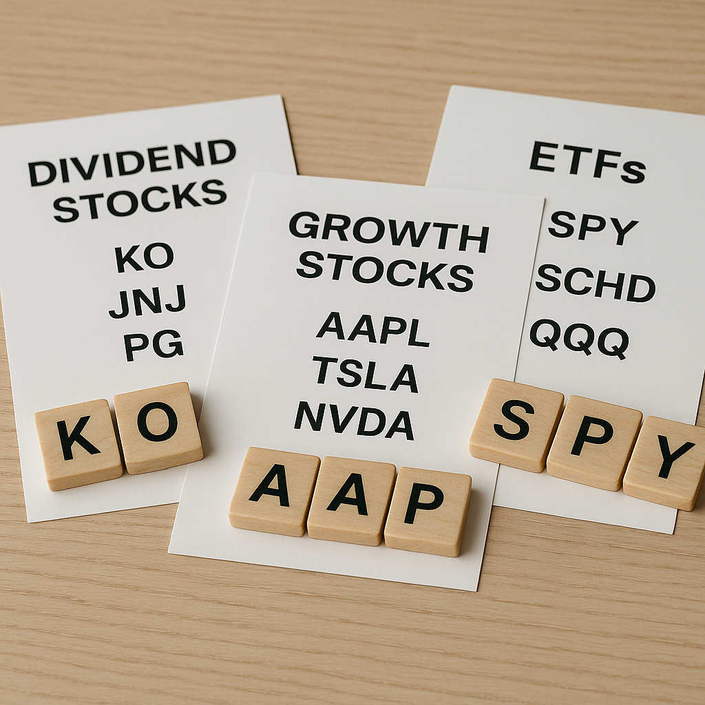 애플(AAPL), 아마존(AMZN) 같은 고가 주식을 부담 없이 살 수 있도록 '소수점 매매' 기능을 지원하는 증권사들이 있습니다. 또한, S&P500을 추종하는 ETF(SPY, IVV), 배당주 중심 ETF(SCHD) 등은 분산 투자에 유리하여 초보 투자자에게 적합합니다.