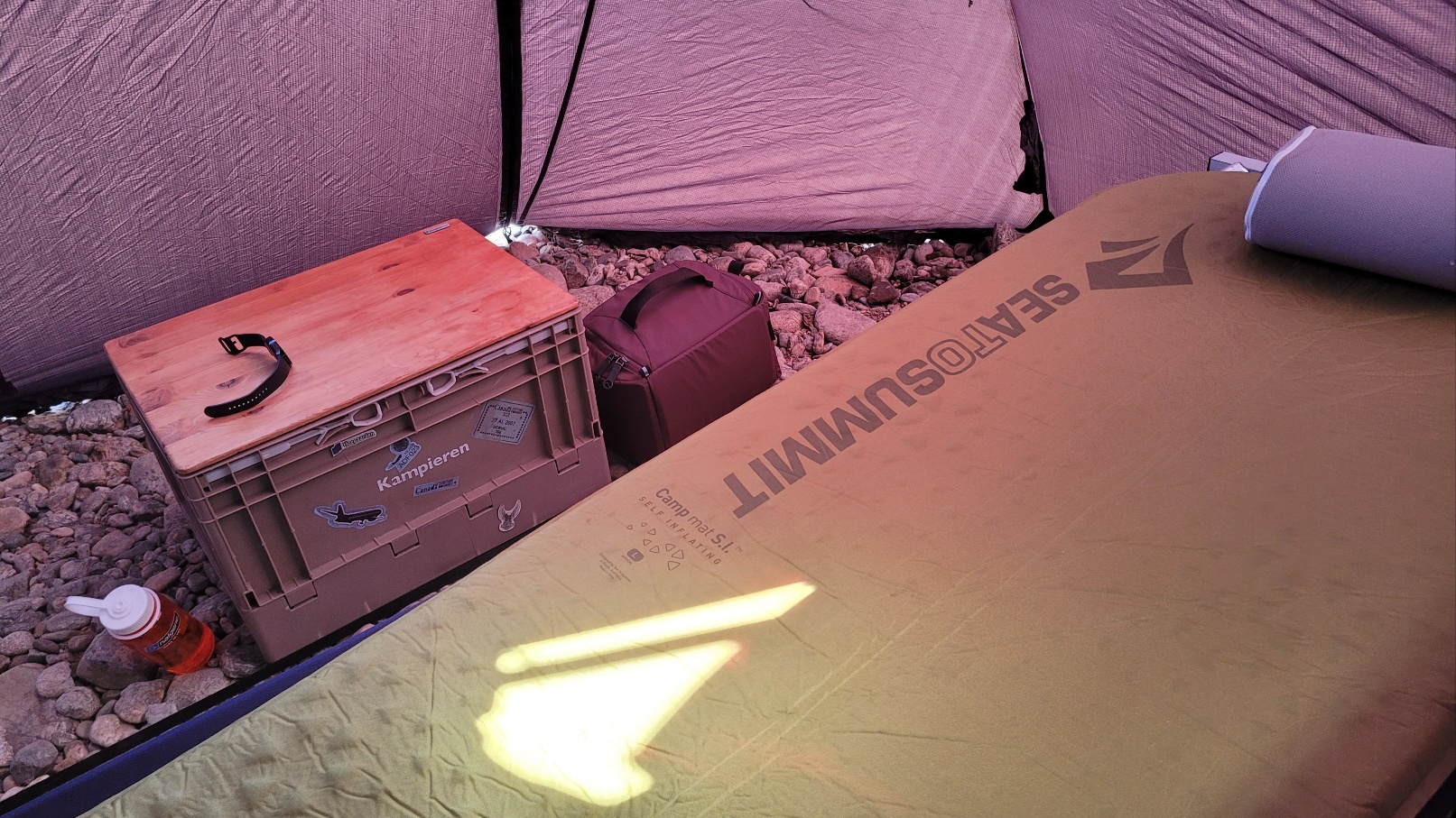 실내에 테이블과 야침, 간단한 조명, 랜턴 설치까지 하면 아늑한 나만의 차박 공간 완성! 낚시 후 피곤함도 잊을 수 있었습니다.
